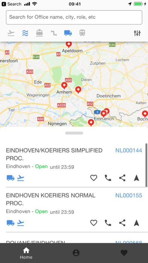 Besides custom offices of exit, CO&GO also shows all EU custom offices on a map, including their functions. By filtering on custom office and way of transport and by zooming out on the map, the relevant offices are shown. With one click on the correct office all relevant and needed details are shown.
