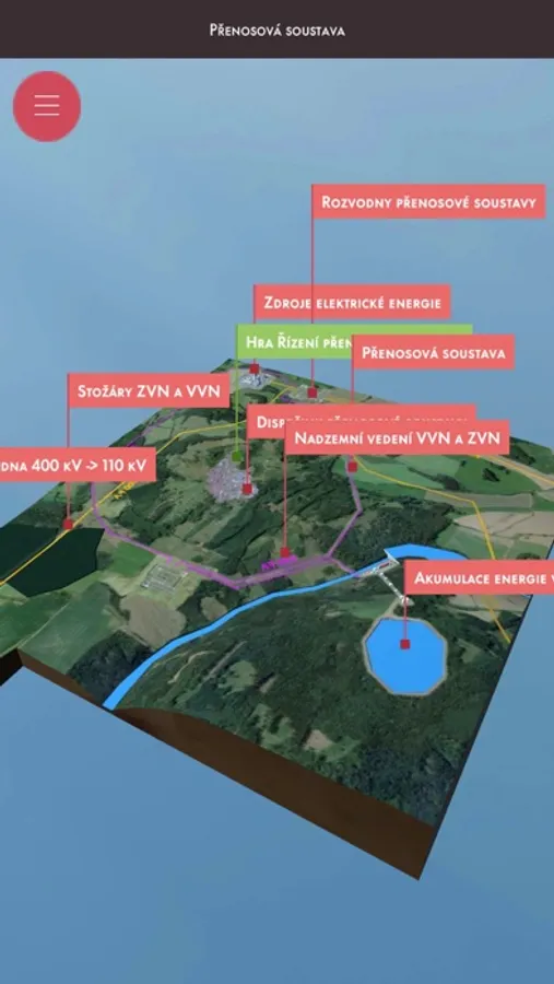 Seznamování s přenosovou soustavou začíná pohledem na 3D model části krajiny se zvýrazněnými objekty, které mají určitý vztah k přenosu elektřiny. Posouváním, otáčením a přibližováním scény si lze krajinu s objekty prohlížet z libovolné perspektivy pohledem letícího dronu. Významné objekty umožňují vnoření do nových scén s detailními 3D modely zařízení, ostatní doplňující objekty obsahují pouze krátký vysvětlující popis. V detailním zobrazení je dostupná další, textově-obrazová informační úroveň aplikace, která kromě popisu významu, konstrukce a typů vybraného přenosového zařízení nabízí též množství ilustračních fotografií.