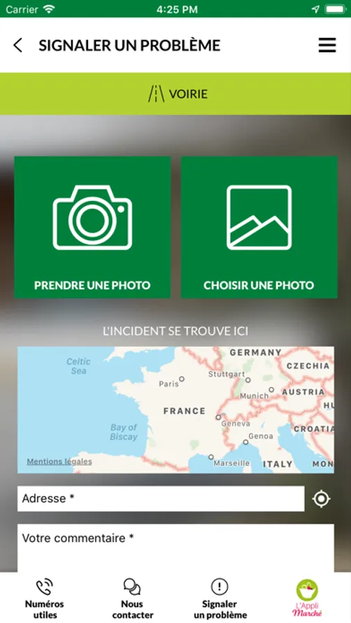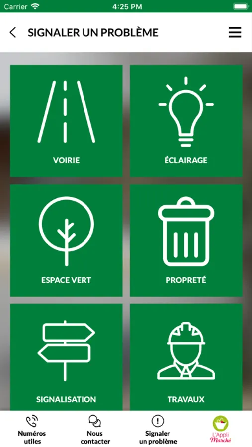 - Signaler un problème à votre mairie en envoyant des photos géolocalisées : voirie, éclairage public, espace vert, propreté, signalisation, travaux, stationnement …