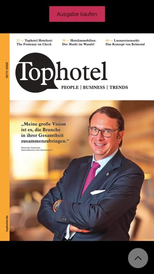 Das Branchenmagazin ist seit über 35 Jahren entscheidender Impulsgeber und glaubwürdiges Sprachrohr für die Hotellerie. In 10 Ausgaben pro Jahr liefert Tophotel fundiertes Expertenwissen und 360-Grad-Inspiration für erfolgreiches Hotel-Business. Mit seinem inhaltlichen Mix aus hintergründigen People- und Management-Stories sowie praxisnahen Trends und Entwicklungen ist die Medienmarke optimal an die Bedürfnisse der Leser angepasst und meinungsbildend im Markt.