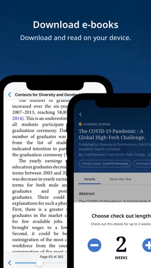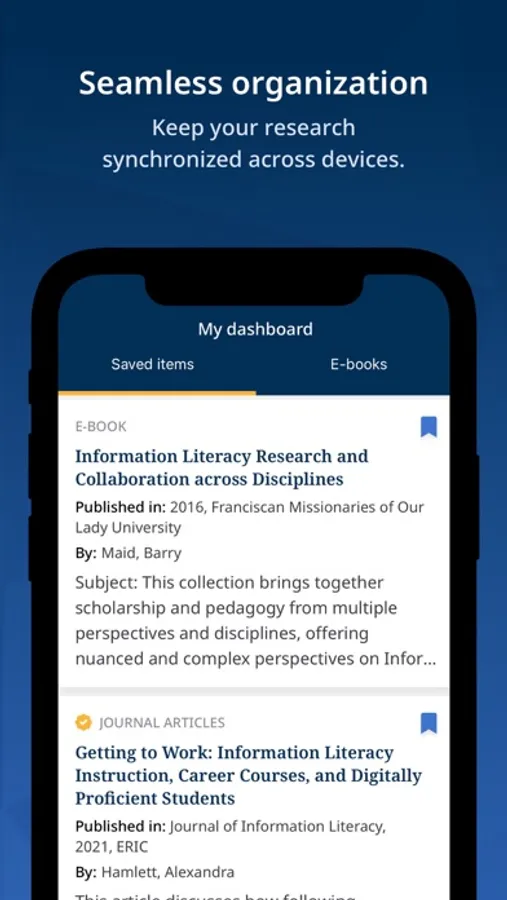 Find and connect to your library, then simply search, choose, and use your library’s content. Continue your research projects even when you’re away from your desk thanks to syncing across desktop and mobile devices. Download and read EBSCO eBooks directly within the app.