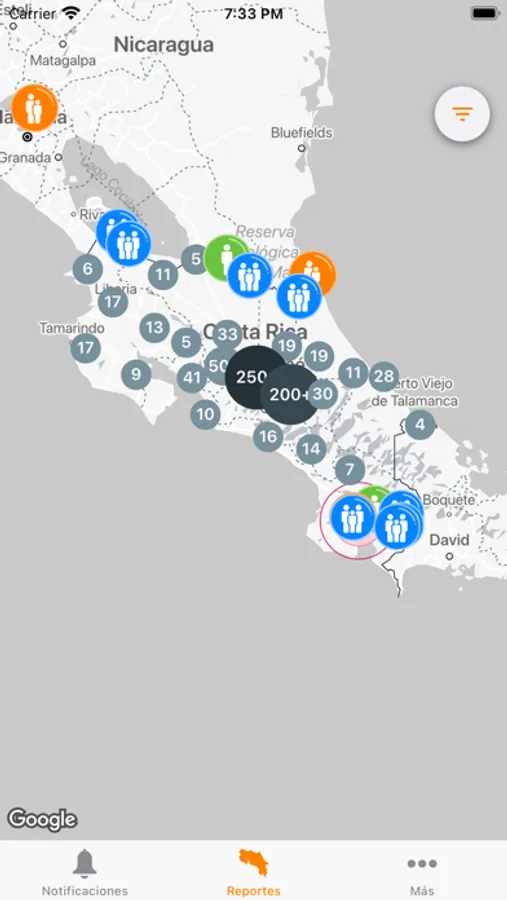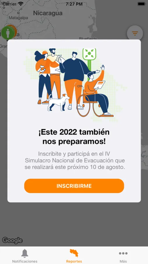 En la APP Simulacro CR podrá observar, mediante un mapa de Costa Rica, los reportes de participación en el simulacro, registrados por los usuarios de la aplicación en todo el territorio nacional.