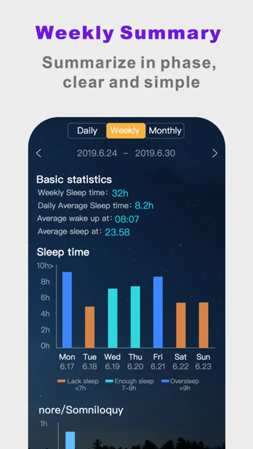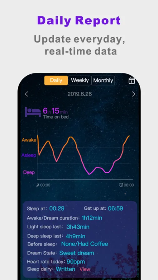 Daily, Weekly, Monthly and Yearly accurate analysis are available. Combined statistics and charts, reports are clear and understandable. Bed time, rise time, average time in bed etc... all you want to know, you can find in your report. ASleeper can help you know more about your sleep,more importantly, change your sleep habits.
