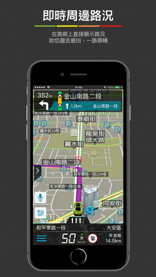 ●提供紅黃綠的顏色標示即時交通路況。