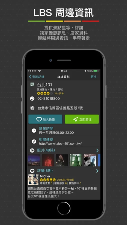 ●提供景點星等、評論、獨家優惠訊息、店家資料等,輕鬆將周邊資訊一手帶著走。