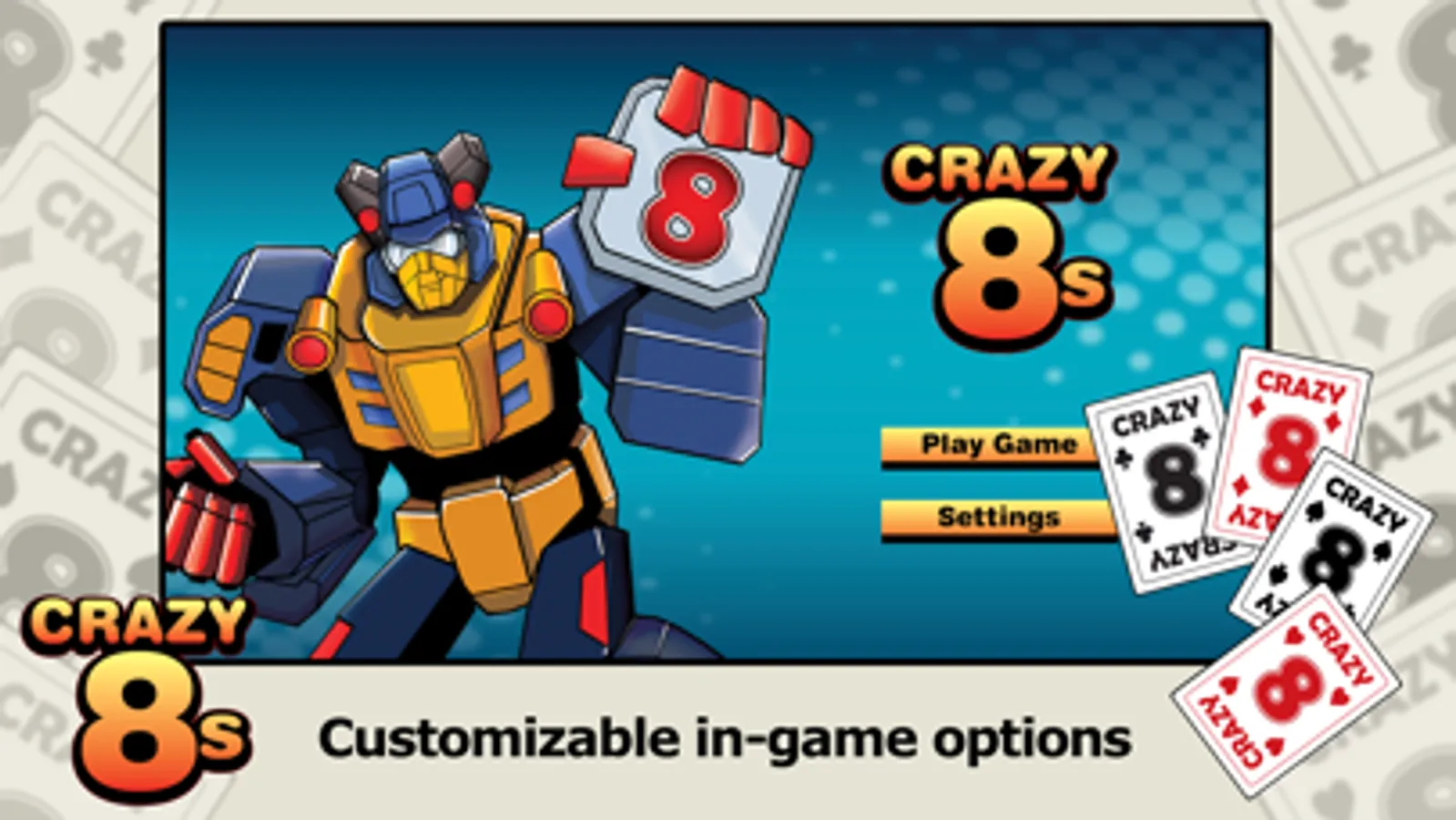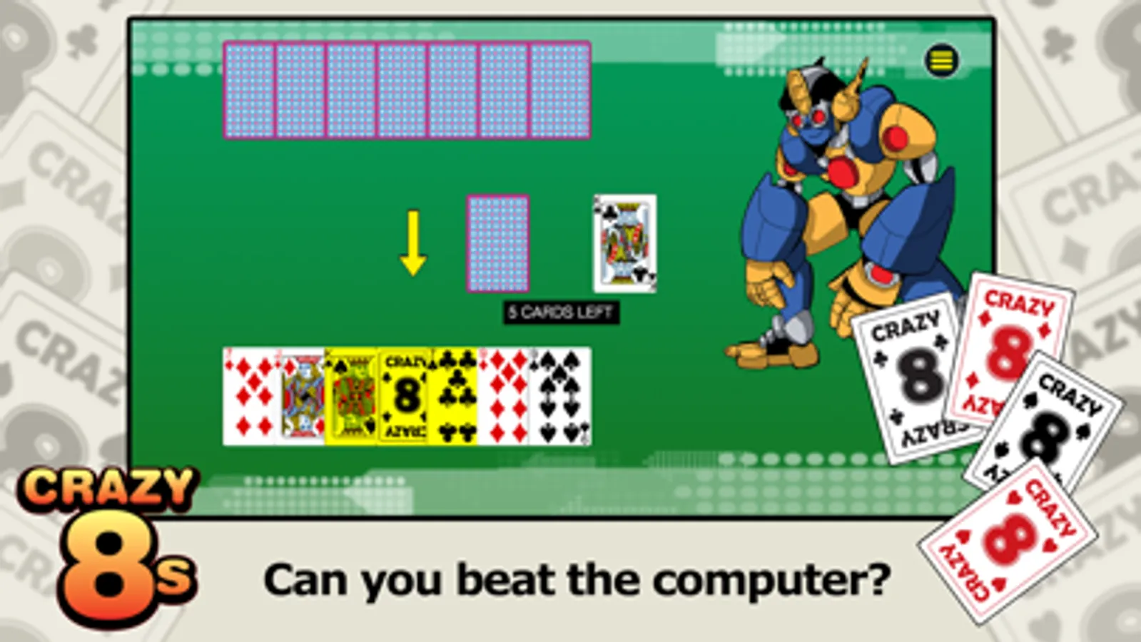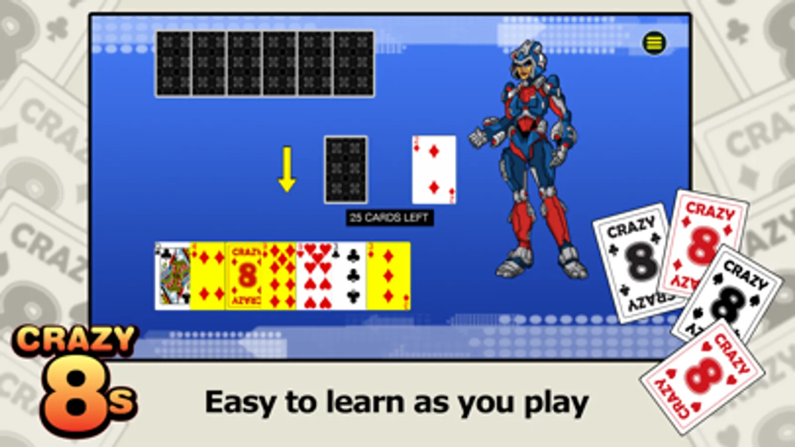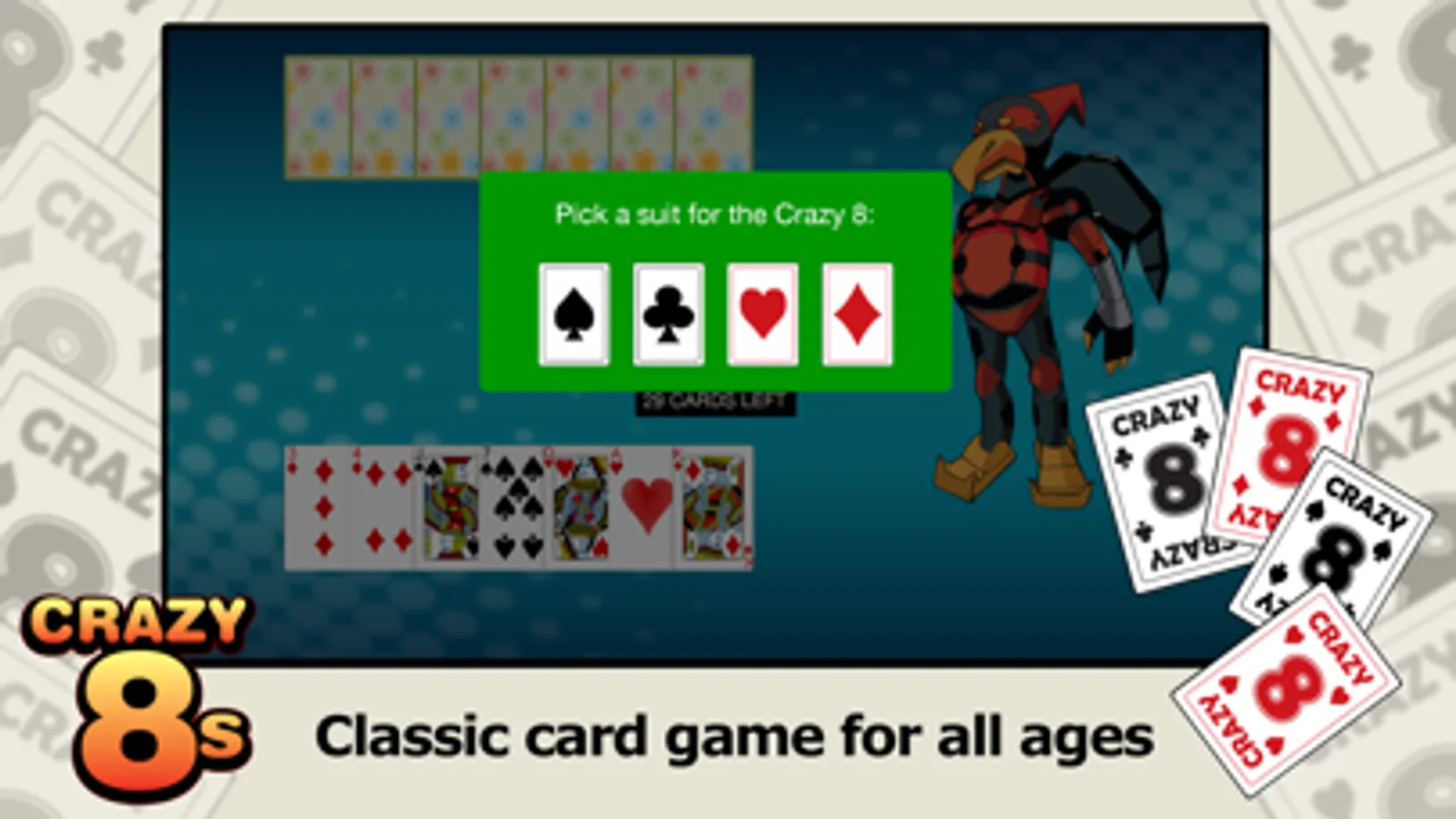 This is a one-player version of the classic Crazy Eights card game for all ages, where you play against the computer. This version of Crazy Eights is easy to learn as you play. Although there are different and complex variations of Crazy Eights, this app uses the simple rule of a limit of one play of a card per turn. Help is provided during the game if you need it.