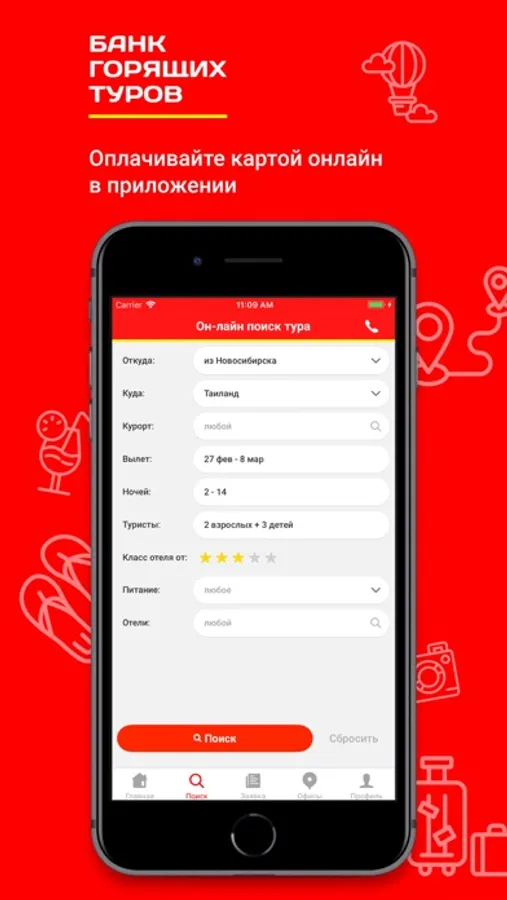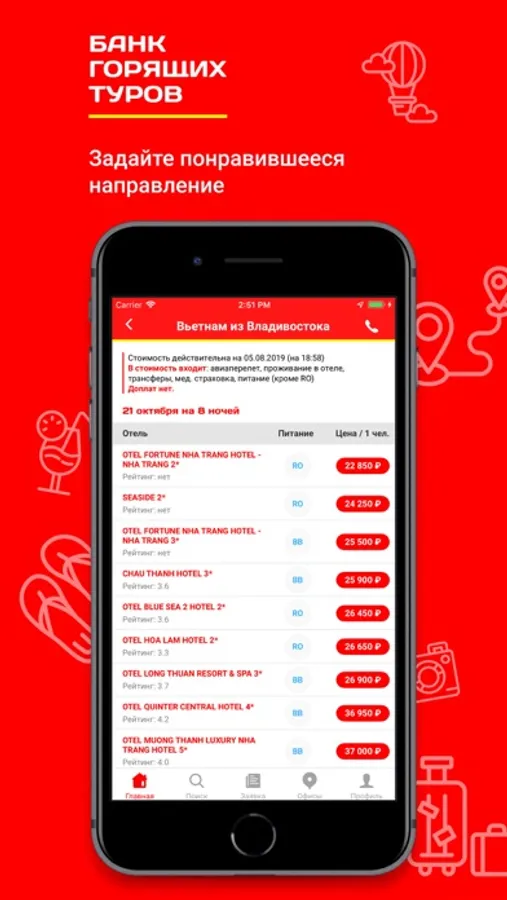 Бесплатное приложение Банк Горящих Туров показывает честные цены без скрытых доплат. В стоимость тура всегда входит: авиаперелет, проживание в выбранном отеле, питание, трансфер и мед. страховка и топливный сбор.