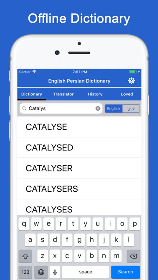 Persian English Dictionary offline and free. You can search both English and Persian words. This is not only a Dictionary but also a learning tool. You can use this dictionary when you have no Internet connection.. There is autosuggestion so you need not type full words. You also can use Speech to text feature. When you start typing, you will see some words starting with the letters you typed. The dictionary searches in a database for the matching words. This will be helpful to find out the meaning of any word.