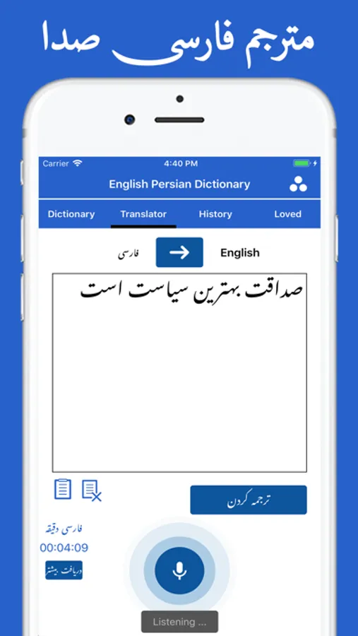 The Free translator can quickly translate from Persian to English and English to Persian (فارسی-انگلیسی مترجم) words as well as complete sentences. Instant translation and the full validity of the words.