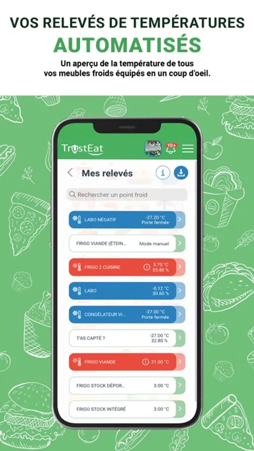 TrustEat permet le suivi détaillé de vos actions hygiènes : relevés de températures automatiques, télé-surveillance des meubles frigos, traçabilité de vos produits, plan de nettoyage et coffre-fort hygiène.