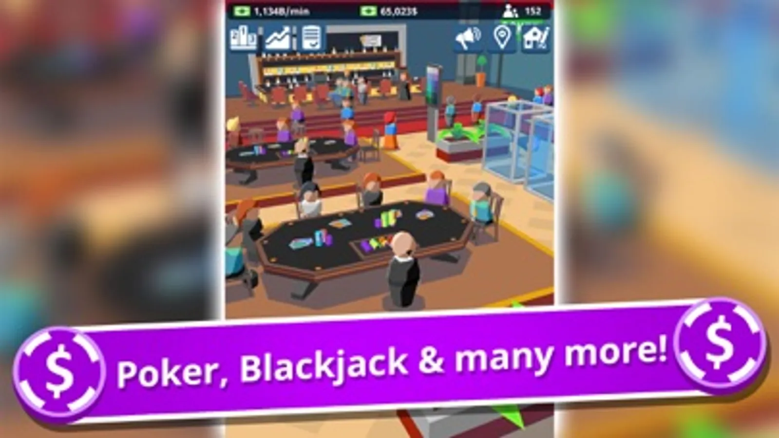 Manage your cocktail bar and exchange booth wisely to earn money. Expand the Casino with new floors and unlock the most amazing games and machines.