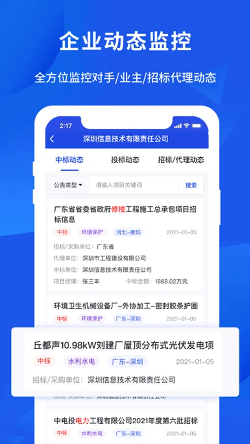 【企业动态监控】7x24小时监控业主、招标代理、竞争对手招投标动态,实时提醒;
