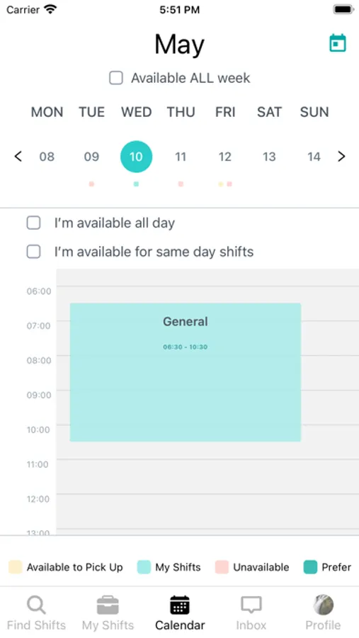 The Hyre app allows current staff on Hyre to find and pick up new shifts as well as log their hours by clocking in and out of their shifts.
