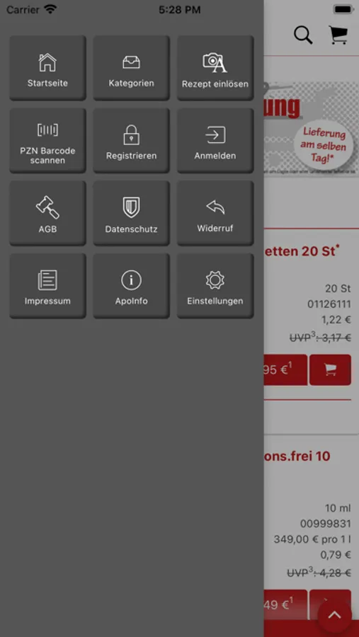 Senden Sie ihre gescannten Rezepte sicher und verschlüsselt über die App zu uns. Bestellen Sie benötigte Arzneimittel zur Abholung vor oder lassen Sie sich diese gleich nach Hause liefern. Auf Wunsch sogar in einigen PLZ Gebieten als Express-Botendienst.