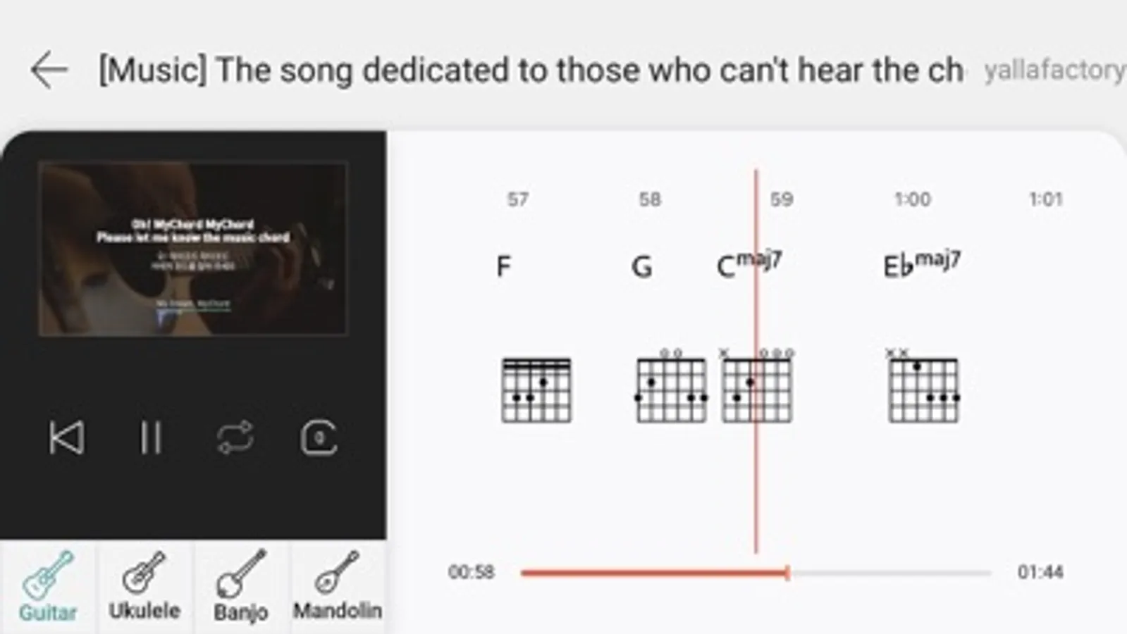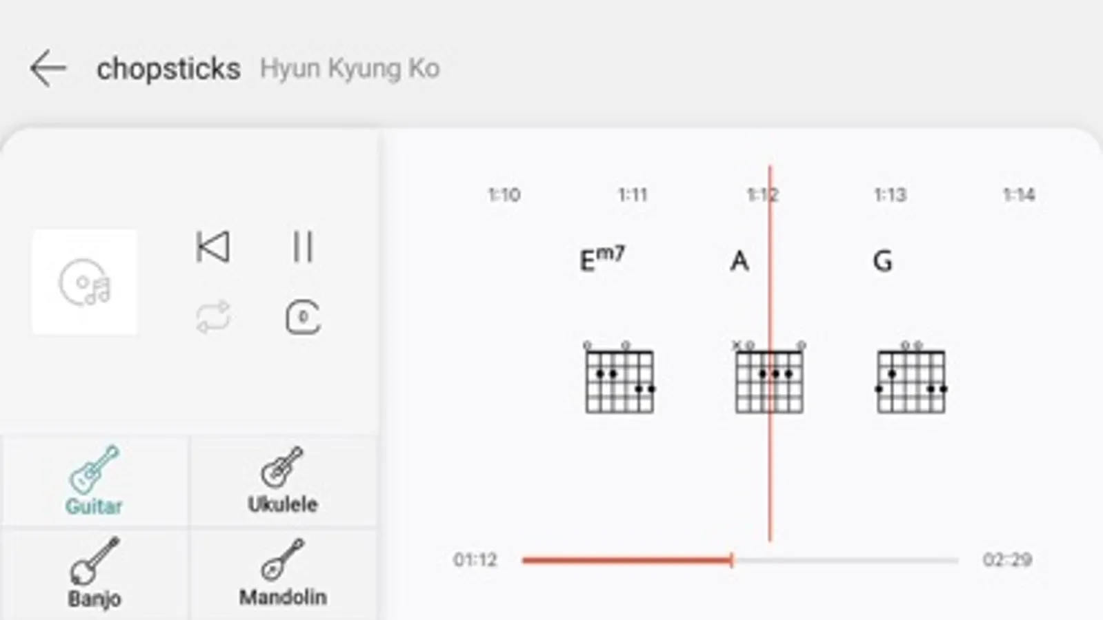 See the chords displayed along with the music and play with instruments such as guitar and piano.