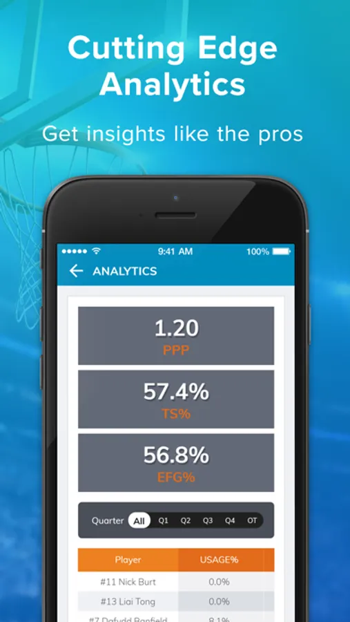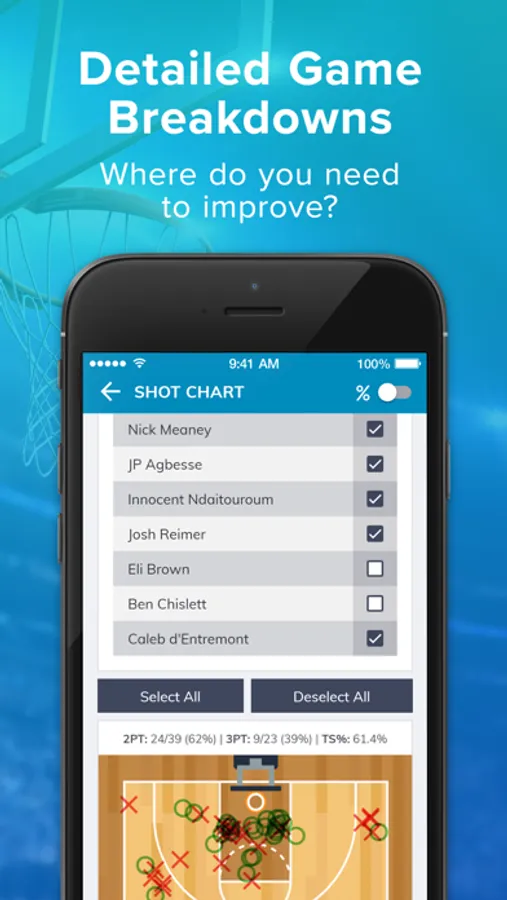 In addition to box score statistics, players also receive shot chart breakdowns and cutting edge advanced analytics. Each player gets their own profile, where their stats get stored all season long. Track your performances, improve your skillset, and get recruited.