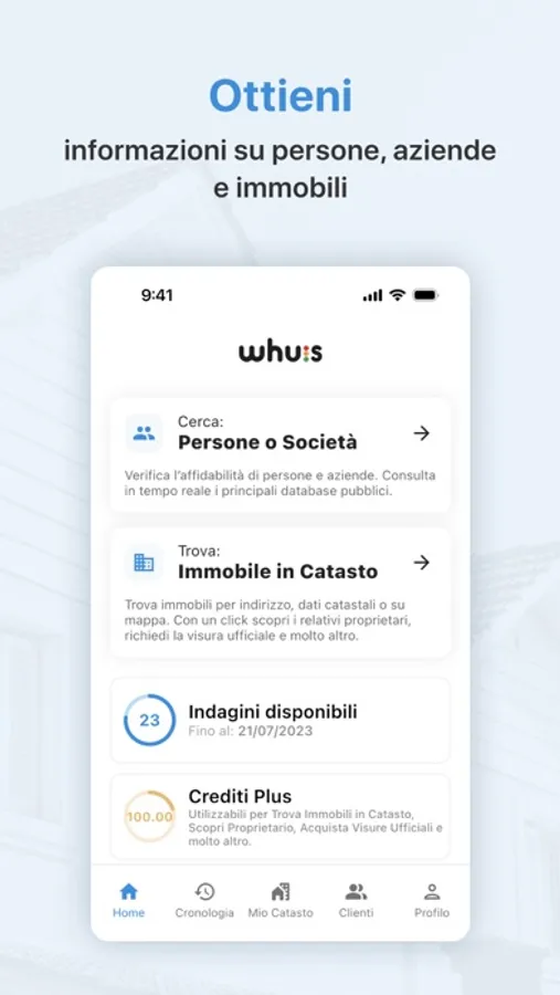 Whuis è la prima e unica App per verificare in tempo reale, con una sola INDAGINE, l’affidabilità di PERSONE e AZIENDE, ricercare IMMOBILI in Catasto, ottenere Visure, Atti Notarili, Mappe Catastali e molto altro.