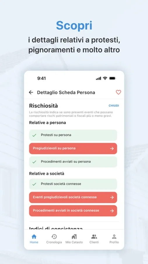 Visualizzi immediatamente in un’unica indagine dati da visura catastale e visura camerale, elenco negatività con dettagli protesti, pignoramenti, pregiudizievoli di Conservatoria, procedure concorsuali, informazioni su cariche aziendali/partecipazioni attive e recesse e molto altro.