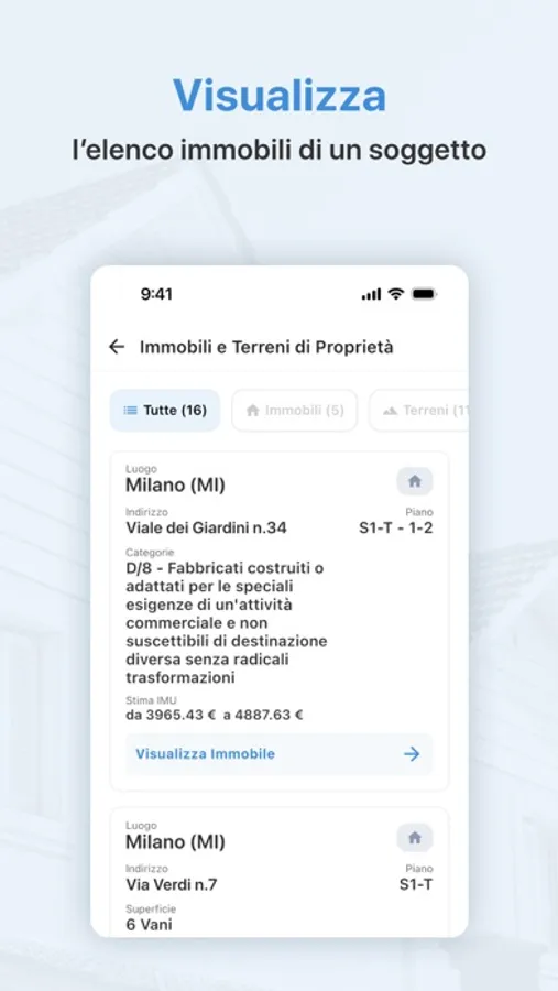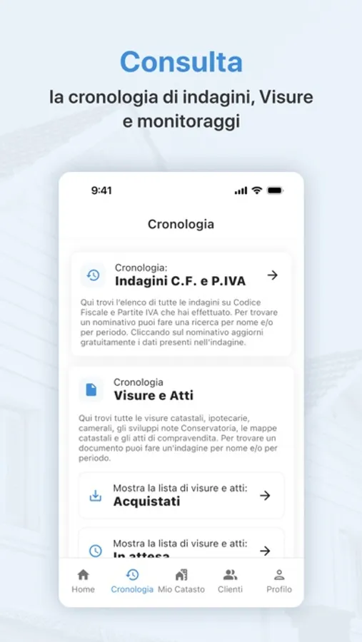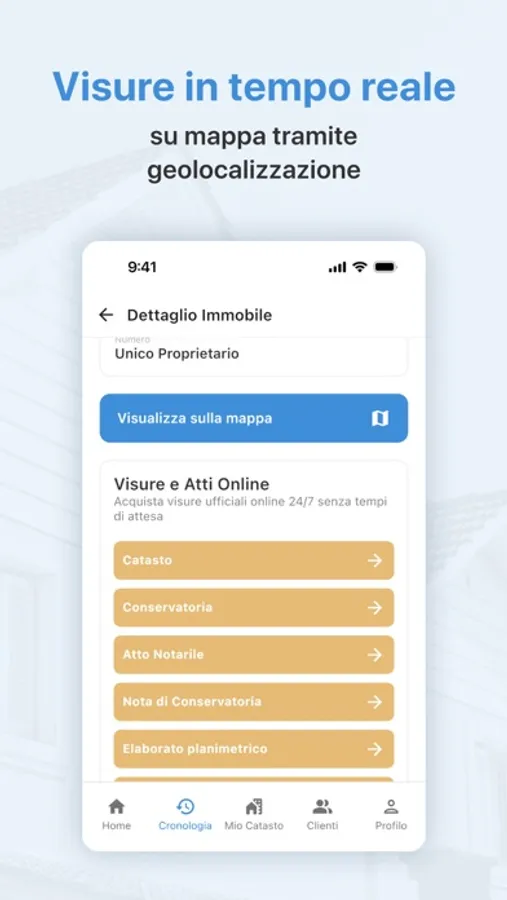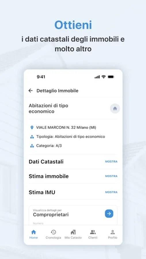 Nella nuova area Mio catasto hai sempre a disposizione tutte le informazioni catastali, le visure, la documentazione e i clienti associati degli immobili che ti interessano.