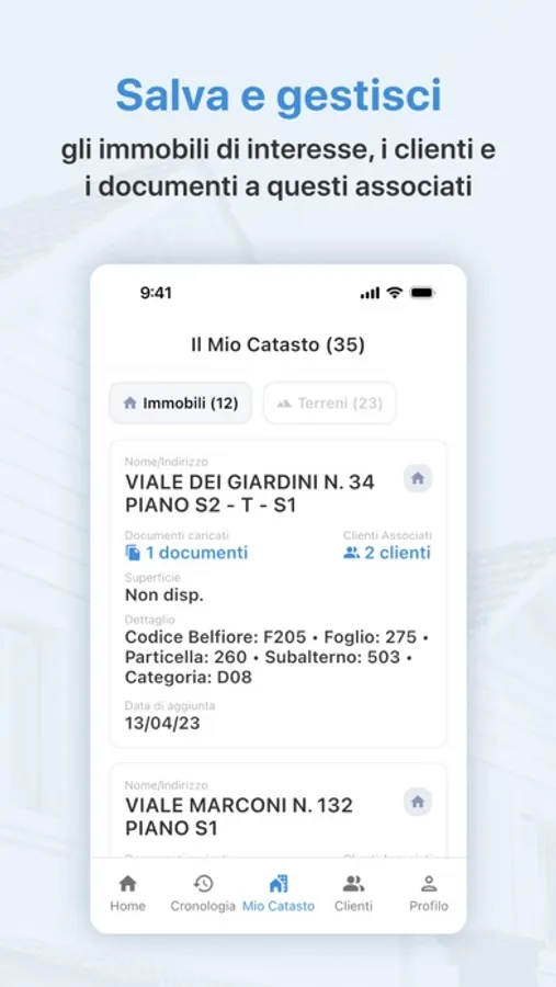Visualizza e cerca tra i clienti che hai salvato, inserisci informazioni aggiuntive (contatti, note, documenti, status, prodotti associati) e associare i clienti agli immobili presenti in Mio Catasto.