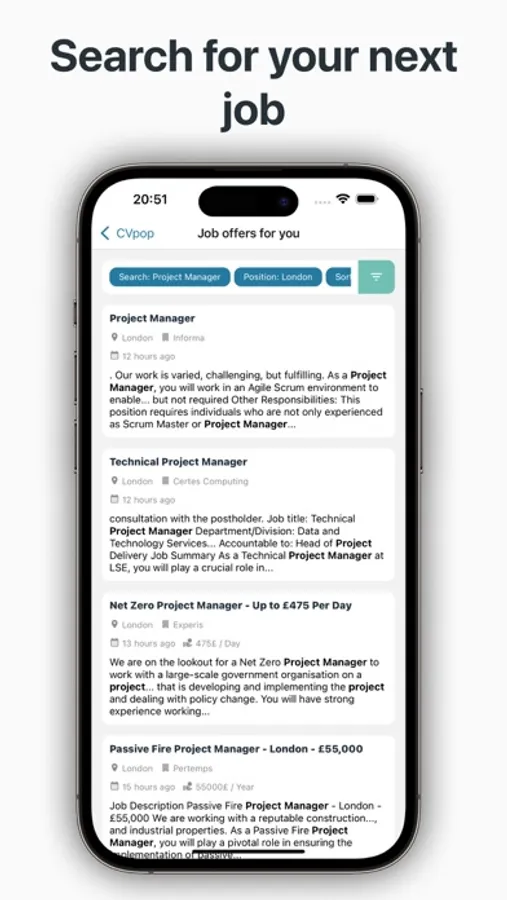 Download CVpop now and say goodbye to boring and outdated resumes! If you have any questions or requests, contact us at info@curriculify.com. Start your search for the perfect job with the most innovative app on the market!