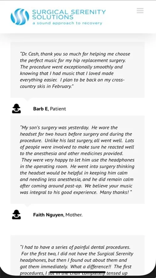 “Promise fulfilled! I was so worried about having general anesthesia for my surgery, but because I was calmed with this music, they were able to do the surgery with spinal anesthesia.”