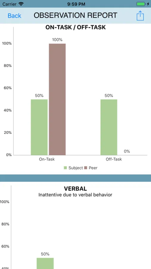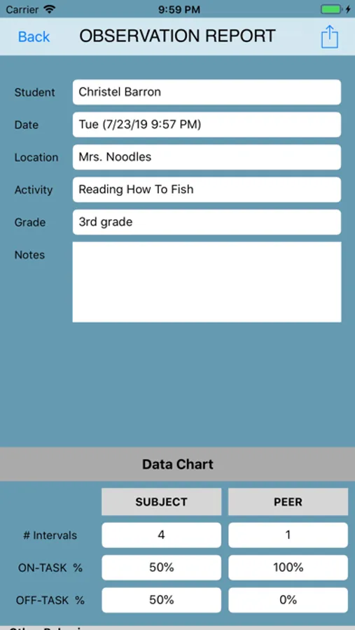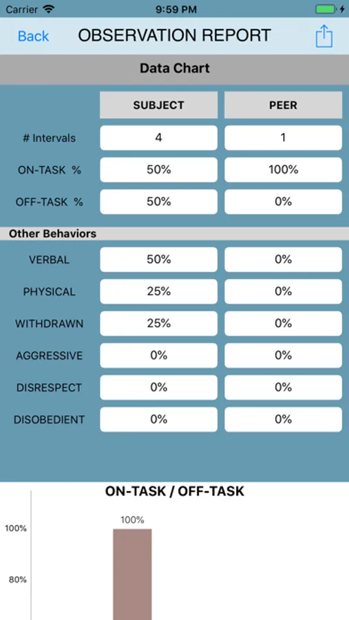 After performing an observation session, you can quickly generate a report, which calculates percentage statistics from your data, as well as chart images that help effectively communicate your data visually. Having graphs and charts are worth a thousand words. Easily show parents and teachers their student’s time on-task compared to their peers.