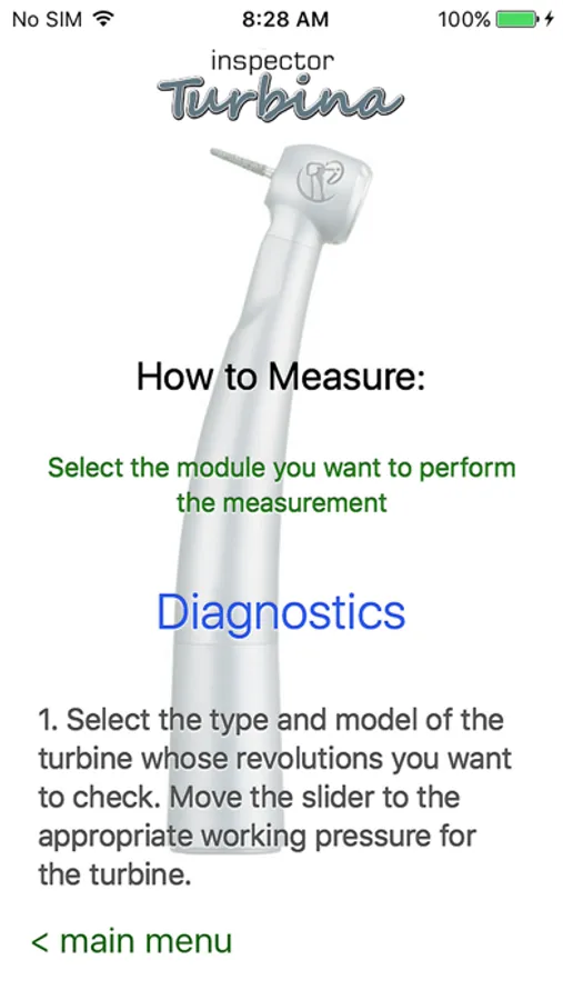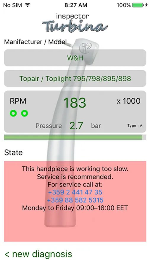inspector Turbina is an application designed to track the turbine speed, to inform dentists of problems arise with the bearings and power of tools and the need for repair.