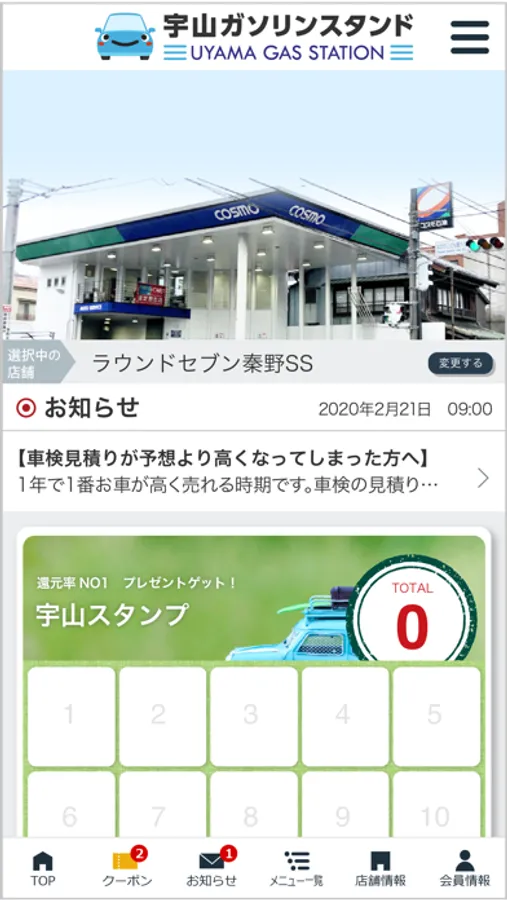 当社の公式アプリ「宇山ガソリンスタンド」ではアプリからお気軽に簡単に洗車などのご予約、ご登録いただいた店舗で利用いただけるお得なクーポンや各種メニューの割引情報の配信、対象商品1,000円ごとにスタンプが貯まり決められたスタンプ数を貯めるとお得なプレゼントクーポンと引き換えができる貯めて楽しいもらえて嬉しいお得なアプリです。