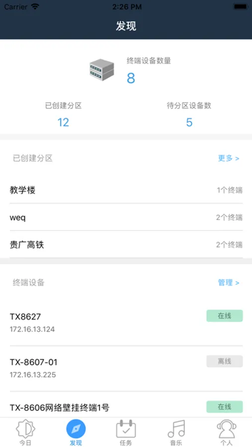 定时任务:APP远程定时编程,实现无人值守定时、定点、定曲的节目播放,可在同一时刻对不同分区播放不同节目,互不干扰。