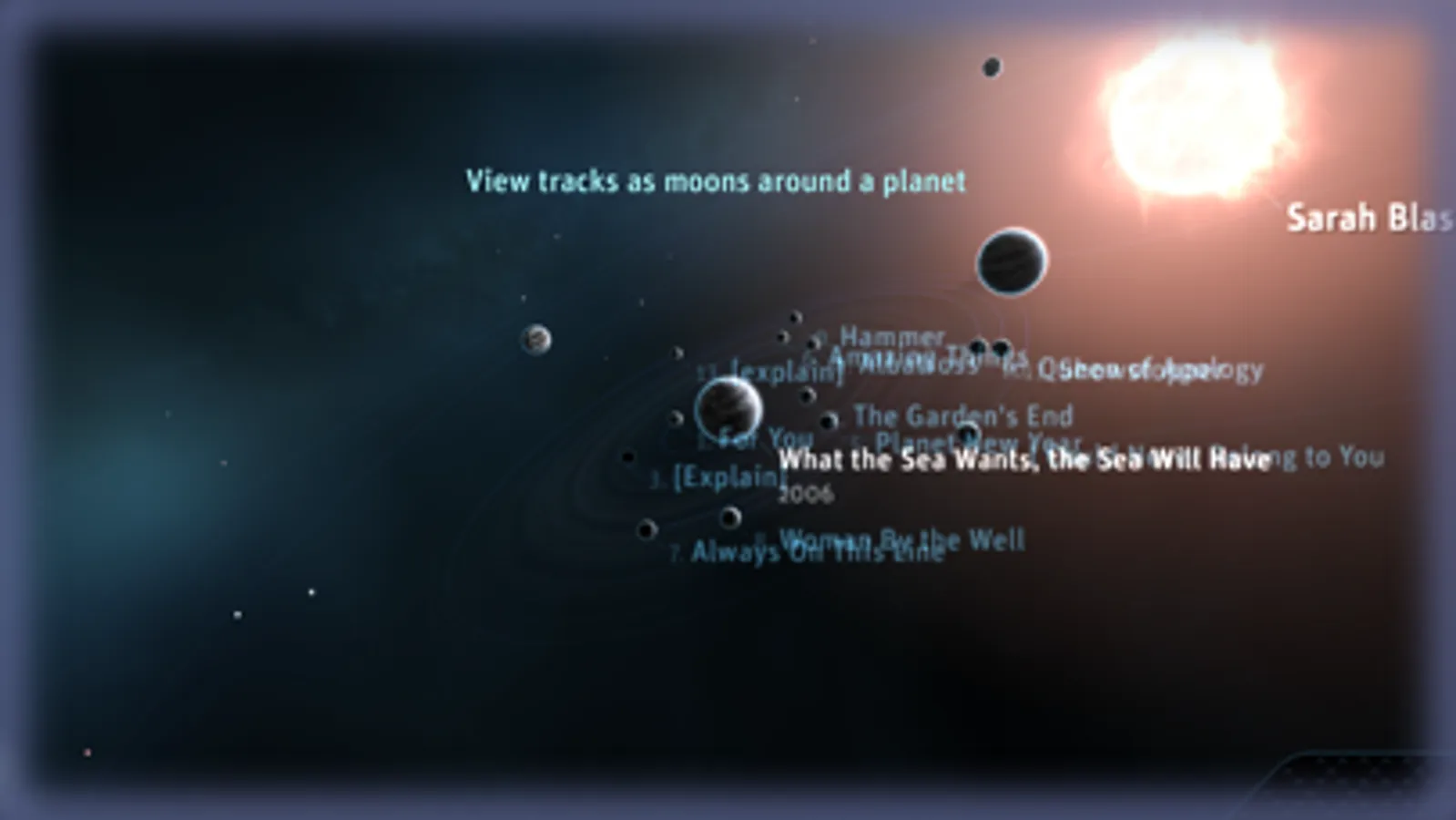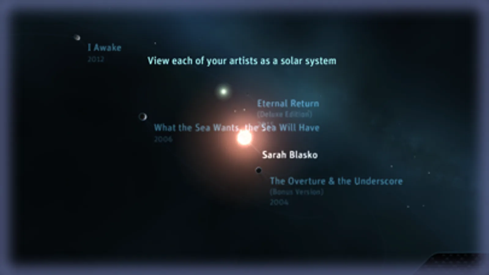 Planetary is a visually spectacular, interactive way to explore your music collection. Soar through a stunning 3D-universe randomly generated using information based on the artists and albums in your personal Apple Music collection.