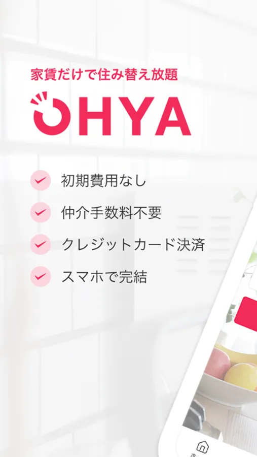 初期費用なし・家賃のみでいつでも住み替えができる新しい賃貸サービス「OHYA(オーヤ)」。スマホで完結し、店舗来店などの面倒な手続きも一切不要です。