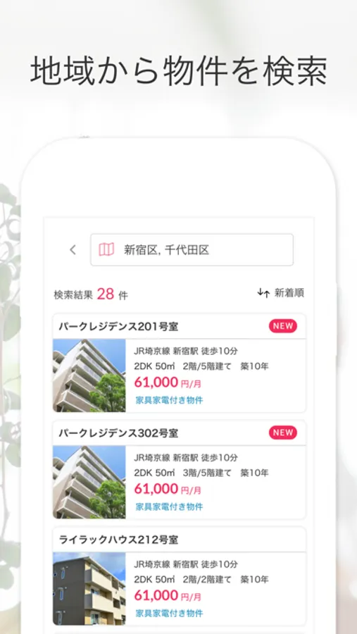・「都道府県」「市区町村」からのエリアから物件情報の検索ができます。