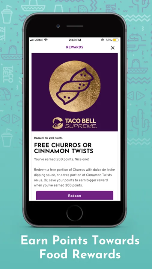 2. Earn & redeem points – As a Taco Bell Supreme member, you’ll earn points with every purchase by scanning your QR code in restaurant or placing a mobile order. Then, use your points to redeem available food rewards of your choice.