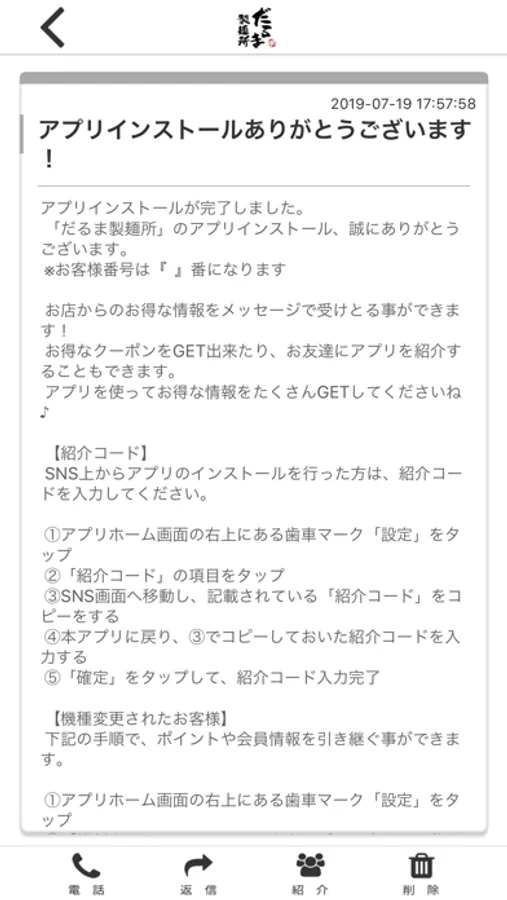 だるま製麺所のアプリをSNSを通じてお友達に紹介する事ができます。