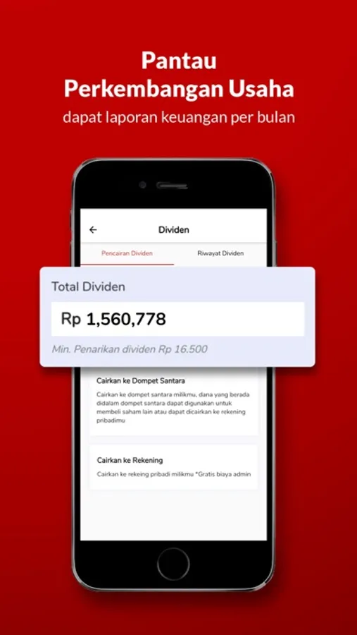 Sebagai pemilik bisnis Anda berhak mendapatkan dividen hasil usaha sesuai dengan porsi saham yang Anda miliki dan kinerja perusahaan. Pembagian dividen bisa 1-2 kali per tahun sesuai RUPS Penerbit.