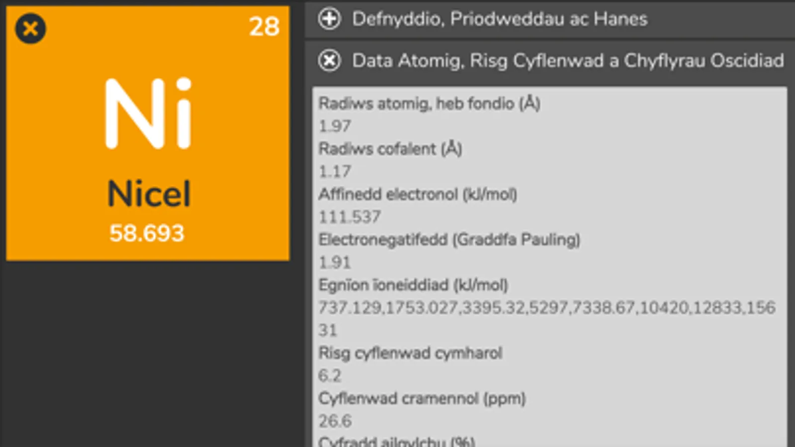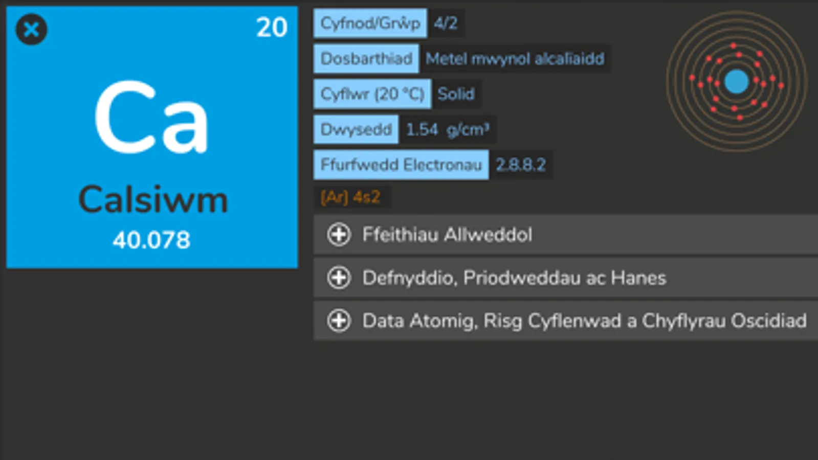 This fact-filled, image-rich, Welsh-medium periodic table app is ideal whether you're a student, teacher, or just have an interest in chemistry.