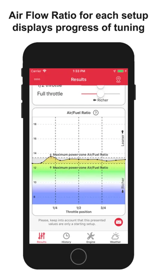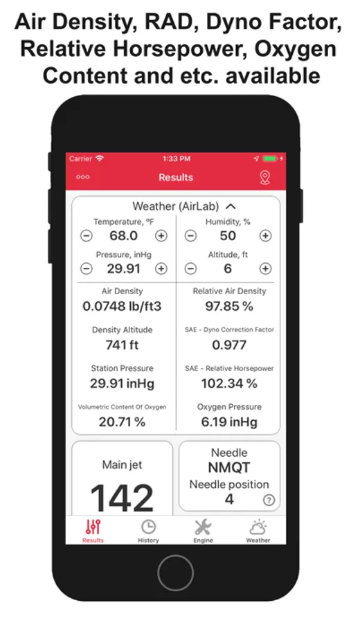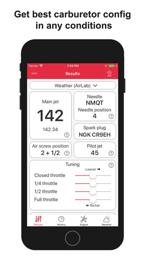 • Results: In this tab main jet, needle type, needle position, pilot jet, air screw position, spark plug are shown. These data are calculated depending on the weather conditions and the engine configuration given in the next tabs.