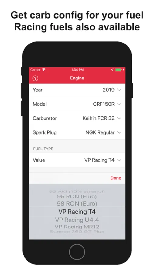 This app provides, using temperature, altitude, humidity, atmospheric pressure and your engine configuration and fuel type, a recommendation about best jetting (carburetor configuration) and spark plug to use for Honda 4-strokes MX bikes (CRF-R and CRF-X models) with Keihin FCR carburetors.