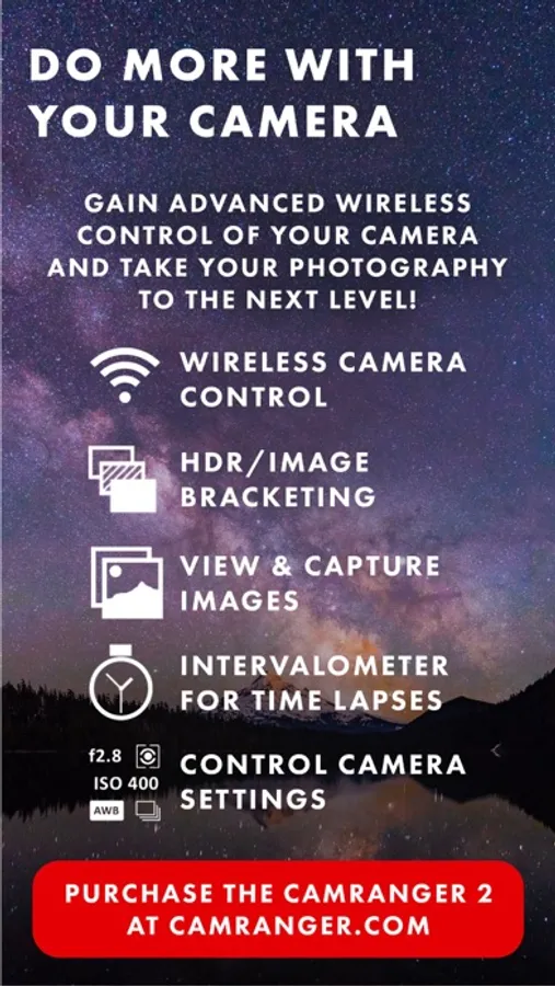 The CamRanger 2 provides reliable, professional level wireless camera tethering and control of your Canon, Nikon, Sony, or Fujifilm camera with your iPad or iPhone.