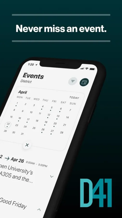 The event section shows a list of events throughout the district. Users can add an event to your calendar to share the event with friends and family with one tap.