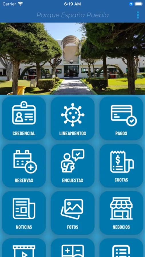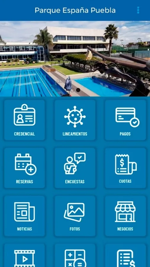 Aplicación para los usuarios del Parque España de Puebla. Control de acceso, pago de cuotas, estado de cuenta, reserva de instalaciones, reportes, gimnasio, fotos y video