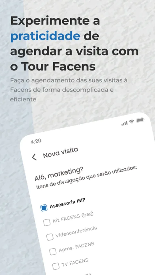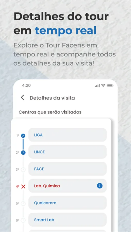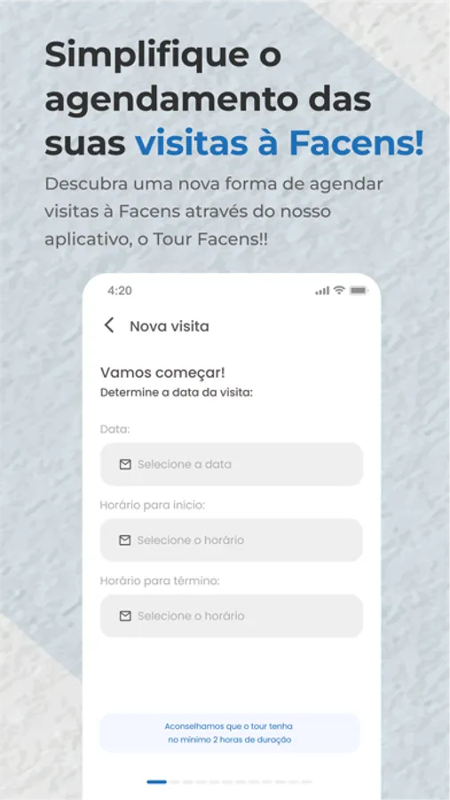 Com o app Tour Facens você pode organizar os inícios e términos de cada visita que passa pelos setores da Faculdade. Mais facilidade na elaboração de novos cadastros.