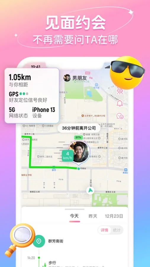 在这里你可以随时查看另一半位置和移动轨迹,TA曾去过哪儿、待了多长时间都清晰可见。更多情侣专属功能,让你们守护彼此的安全,让爱时刻在线!!!