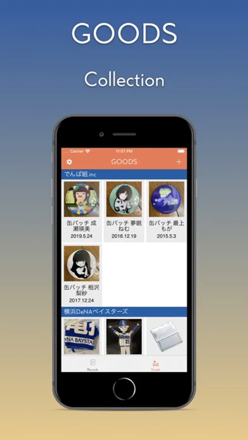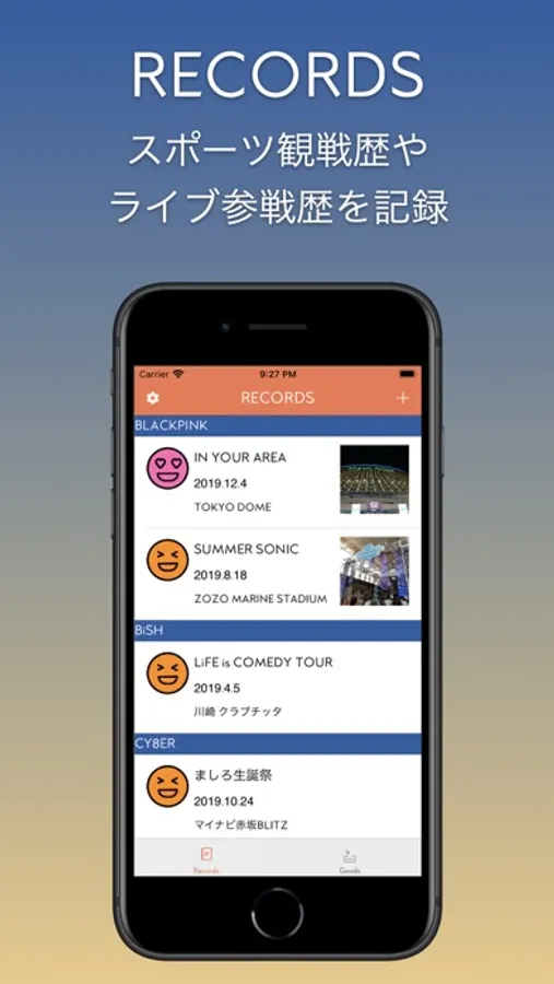 スポーツ観戦の際は試合内容や達成された記録、またコンサートを見に行った際は、セットリストや出演者などを記録するRECORDS機能と、趣味や記念に買ったグッズを一覧表示でコレクションするGOODS機能があります。