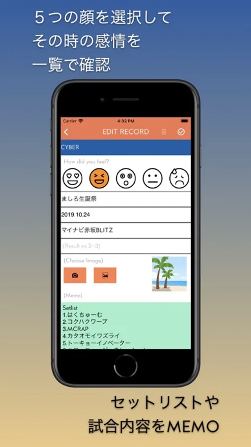 4.日付、場所、写真(1枚)、メモを任意で登録