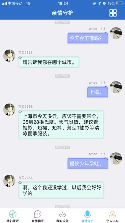 亲情聊天:用户可以使用APP与机器人实时语音对话、文字聊天