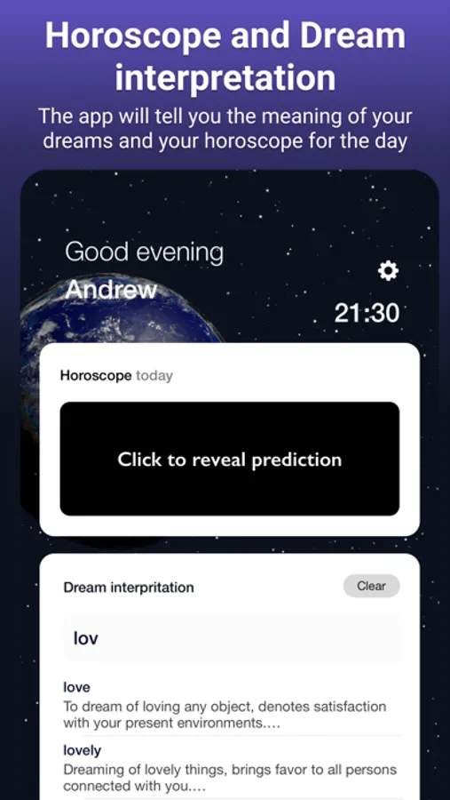 3. Dream Interpreter – due to embedded Dream Dictionary you can learn the meaning of your dream. More than 10000 explanations on 7 languages. Just enter the necessary word in the search bar.