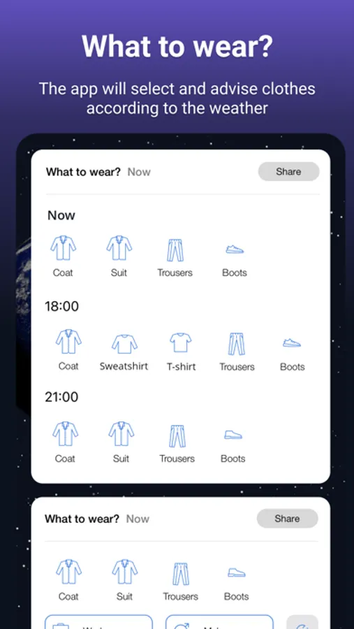 5. What to wear? – the app will select and advise clothes according to the weather for the next 1-8 hours.