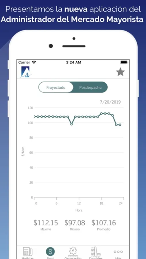 Con esta aplicación podrá consultar las gráficas del Spot Proyectado y Posdespacho, de la Generación Programada y Real, y de los Caudales Declarados por Generador. Recibirá también notificaciones de las noticias y eventos publicados. En el caso de los eventos, podrá programar recordatorios para su calendario. También podrá acceder a Estadísticas de programación diaria y ponerse en contacto con nuestras oficias.